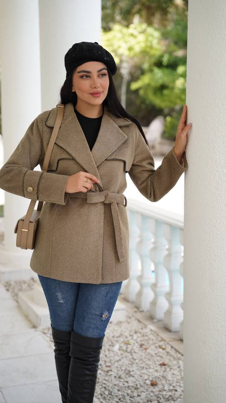 پارچهی نرم و گرم این مدل، برای روزهای خنک پاییز و زمستان کاملاً مناسب است. یقهی بزرگ و برشهای دقیق دوخت، به استایل شما جلوهای خاص و زنانه میدهد. وجود کمربند در قسمت کمر باعث میشود فرم اندام زیباتر و متناسبتر دیده شود