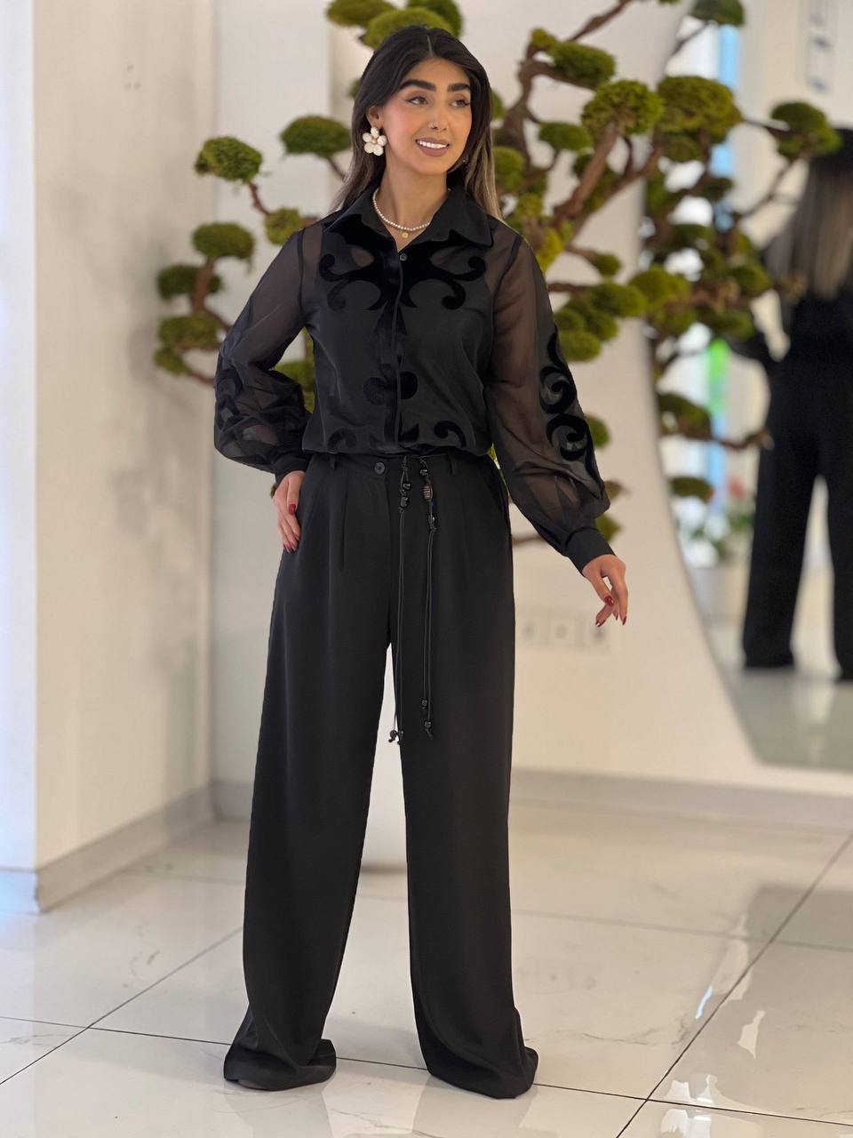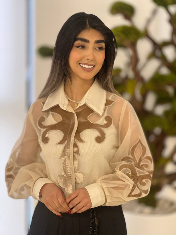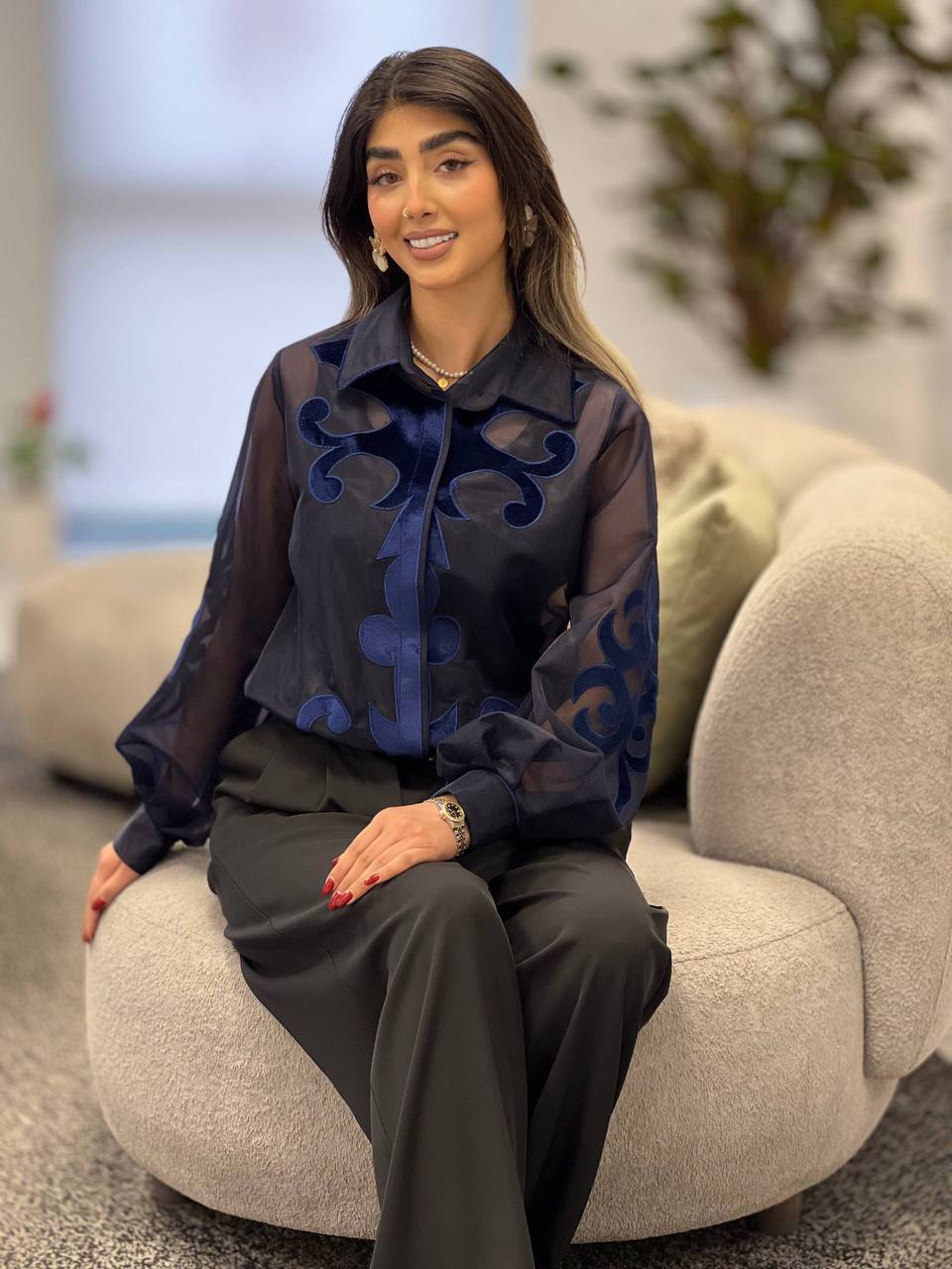 گلدوزیها با ظرافت انجام شده و در کنار تیکهدوزی مخمل، جلوهای لوکس و چشمگیر به شومیز داده است. این جزئیات باعث شده مدل برای استایلهای مجلسی و نیمهرسمی انتخاب مناسبی باشد، بدون اینکه بیش از حد شلوغ به نظر برسد.